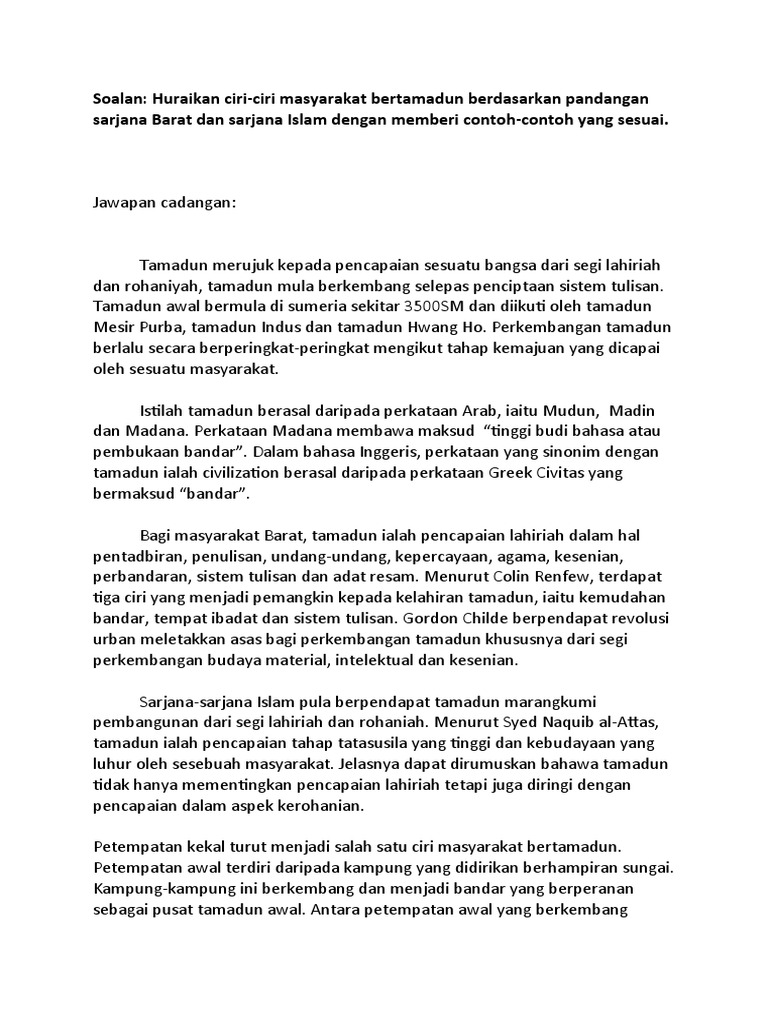 Beliau menggunakan perkataan 'umran sebagai merujuk kepada 'tamadun' yang kita fahami sekarang. Sebagai kesimpulannya sesebuah tamadun sebenarnya bergantung kepada ciri ciri dan sikap sesebuah masyarakat yang dipamerkan selain daripada dasar pembangunan sesebuah negara. Sehubungan dengan itu, kajian ini bertujuan untuk mengenal pasti peranan bahasa dalam proses pembentukan tamadun malaysia dan melihat hubungan kesantunan berbahasa dengan nilai sosiobudaya masyarakat di malaysia. Ciri ciri masyarakat bertamadun dalam konteks tamadun malaysia. Soalan objektif 1 c 2 b 3 a 4 b 5 a 6 d 7 a 8 d 9 b 10 b 11 c 12 b 13 d 14 d 15 d 16 a 17 d 18 d 19 d 20 a 21 b 22 b 23 c 24 a 25 b bahagian b: Ciri ciri tamadun wla 104 03 pengajian islam. Ciri tamadun awal dunia ialah mempunyai petempatan kekal penduduk nomad mula hidup menetap di kawasan lembah sungai yang subur. Cara mengatasi dadah di malaysia. Ciri ciri masyarakat bertamadun dalam konteks tamadun malaysia 10 ciri etika kerja juruteknik 3 phase induction motor iec nameplate 11 september 2017 cuti 1 hari 1 hadis buku 2nd class lower cgpa 3 kepentingan hidupan liar di malaysia 2 ayat terakhir al baqarah beserta artinya 18 suku kaum orang asli di malaysia Cara cara untuk mengatasi penyalahgunaan dadah. Ciri ciri masyarakat bertamadun dalam konteks tamadun malaysia. A) petempatan kekal salah satu ciri utama kemunculan tamadun ialah kewujudan petempatan kekal secara menetap membawa kepada corak kehidupan yang lebih sistematik.kawasan yang dipilih untuk petempatan adalah penting untuk memastikan bekalan makanan.ini akan melahirkan kemajuan di dalam bidang pertanian terutamanya dari segi penanaman dan penyimpanan makanan serta penternakan.kepandaian manusia. Dalam konteks malaysia, hubungan harmoni antara pelbagai kumpulan etnik dapat membina sebuah masyarakat malaysia yang teguh.